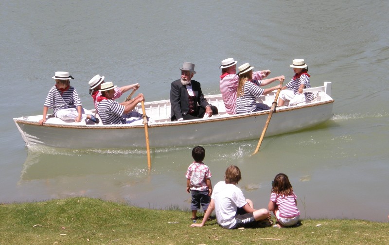 rowing eight kilometres from Nor West Bend into Morgan in wooden boats dressed in the sailor uniform